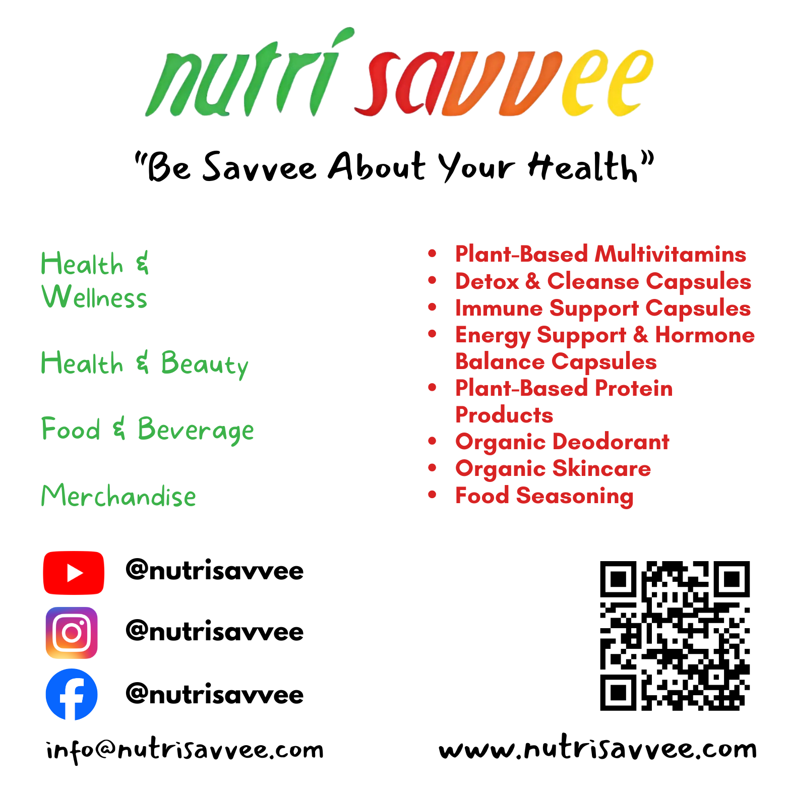 An online, health & wellness and health & beauty convenience store. And with Nutri Savvee's plant-based multivitamins, full body cleanse capsules, plant-based protein products, 100% natural deodorant and skincare products, you can easily maintain a healthy balance in life.